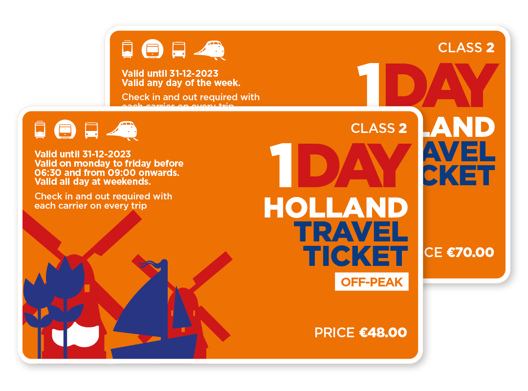 A one-day ticket that is valid for train, tram, bus and metro throughout the Netherlands. Choose between peak or off-peak travel.